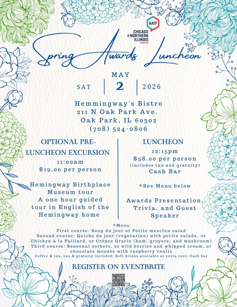 All our chapter members are invited to this event to celebrate and honor the Prix d'excellence and the Illinois French Teacher of the Year awardees.